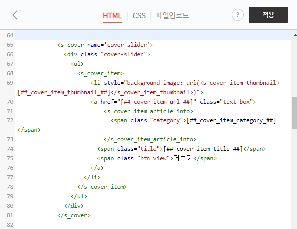 69번 라인으로 가보면 커버 슬라이더 부분이 빨갛게 되어 있습니다. 태그가 짬뽕이라 아래까지 오류가 떴네요. 신기하게도 이렇게 오류가 난 상태인데 그대로 써도 문제는 없더라고요. 그래도 찝찝하니까 바꿔 봅시다. 아래 코드를 복사해서 69번 라인을 지우고 붙여 넣습니다.