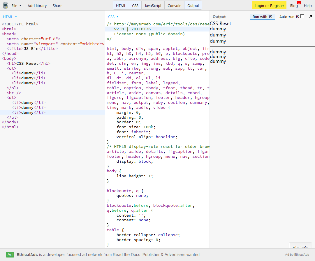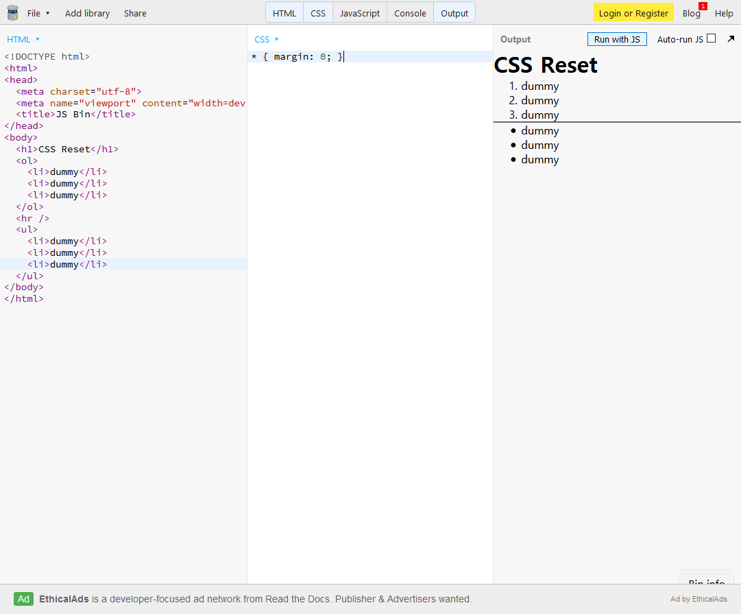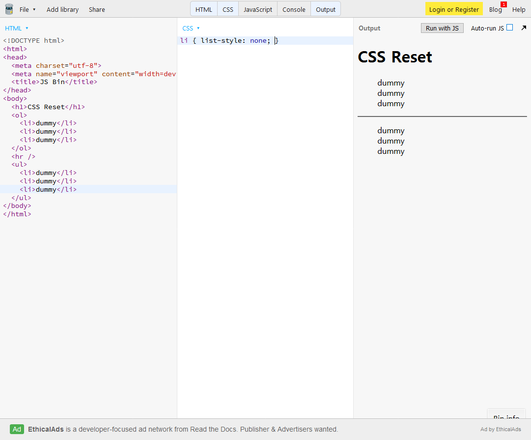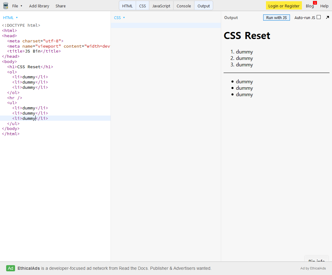 그리고 많이들 쓰는 Eric Meyer's Reset CSS에서 ol, ul { list-style: none; }를 지우고 붙여넣기를 하면 이렇게 나온다.
