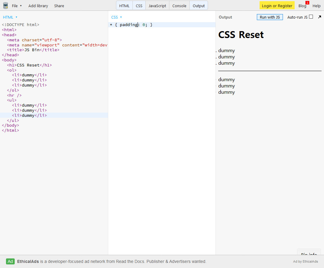 반대로 margin은 그대로 두고 padding만 초기화하면 <ol> 리스트 앞에는 .dummy 와 같이 점이 붙어있는 이상한 모양이 된다.