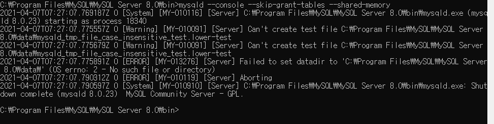 4. mysqld --console --skip-grant-tables --shared-memory 뒤에 --defaults-file="C:\ProgramData\MySQL\MySQL Server 8.0\my.ini" 를 붙여서 입력.