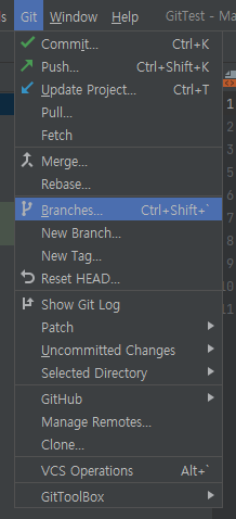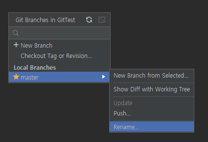 안드로이드 스튜디오는 기본 브랜치 이름이 master로 되어 있다. 브랜치 명을 main으로 바꾸고 싶으면 push하기 전에 Git-Branches에 들어가 로컬 저장소 브랜치 명을 바꾼다.