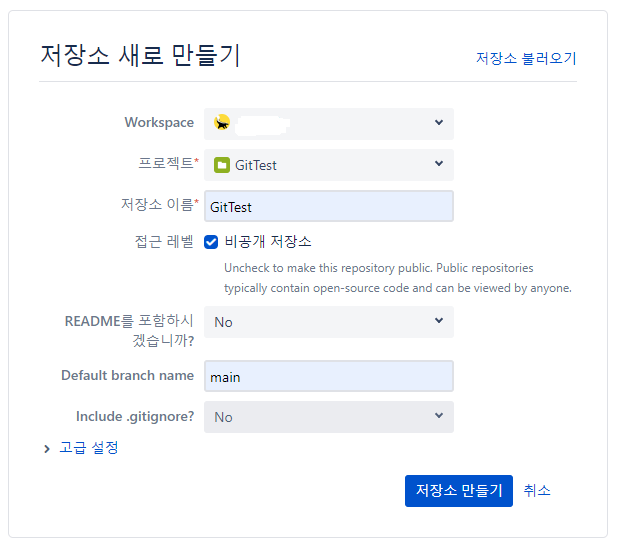 Bitbucket에서 저장소를 만든다.